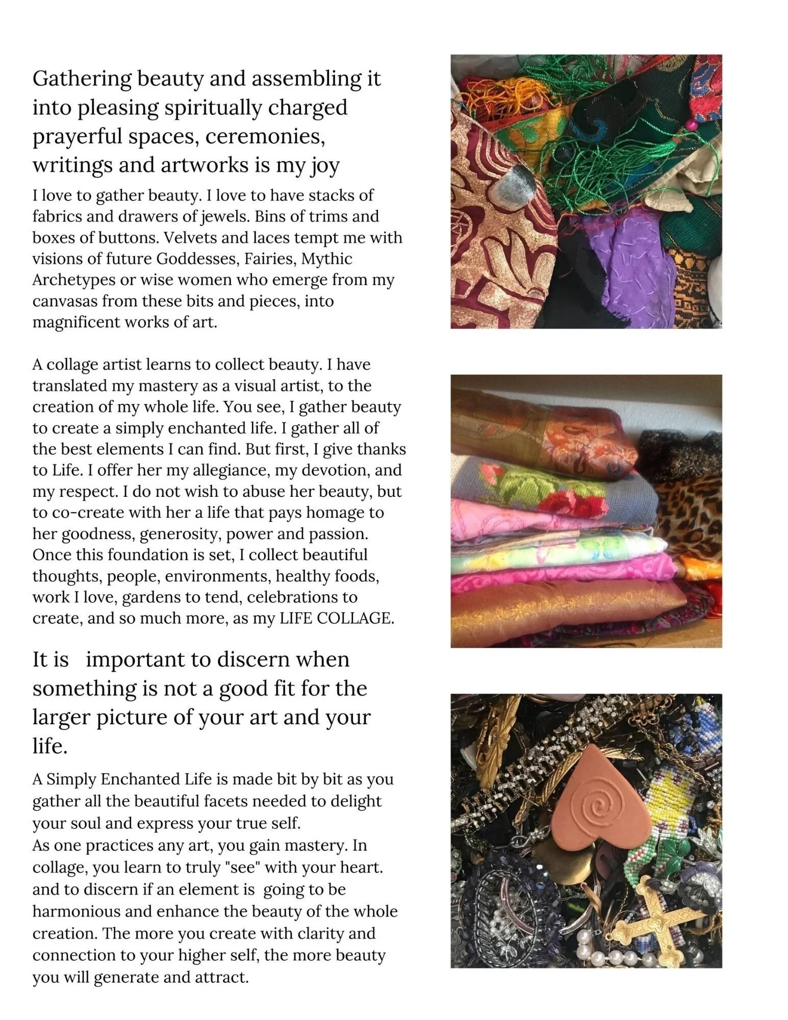 The many steps to creating any kind of beautiful art always require dedication, focus, love and skill. I love being a mixed media collage artist. Using mostly textiles, some new, some recycled, I build my images layer by layer, discovering as I go along, what pieces to put together, digging through draws and boxes and bins of collections. Jewels , appliques, trims, silks, velvets. All of the fabrics i use are of natural fibers, rich with color and texture.